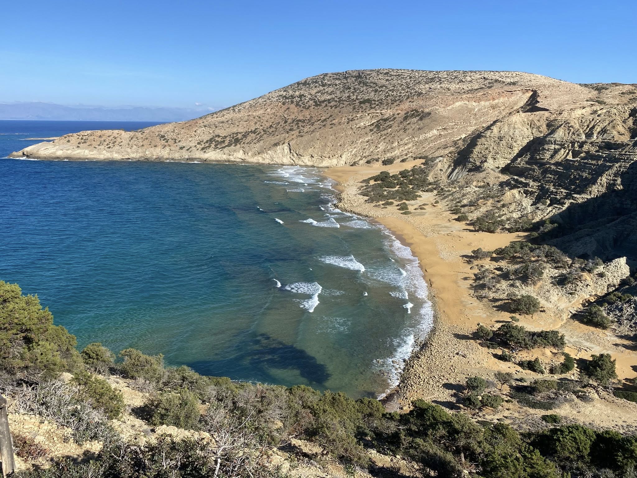 From Ambelos, the path continues downhill toward the coastline. The view opens dramatically, revealing the Libyan Sea and the red sand of Potamos from above — one of those moments that makes you stop without thinking.